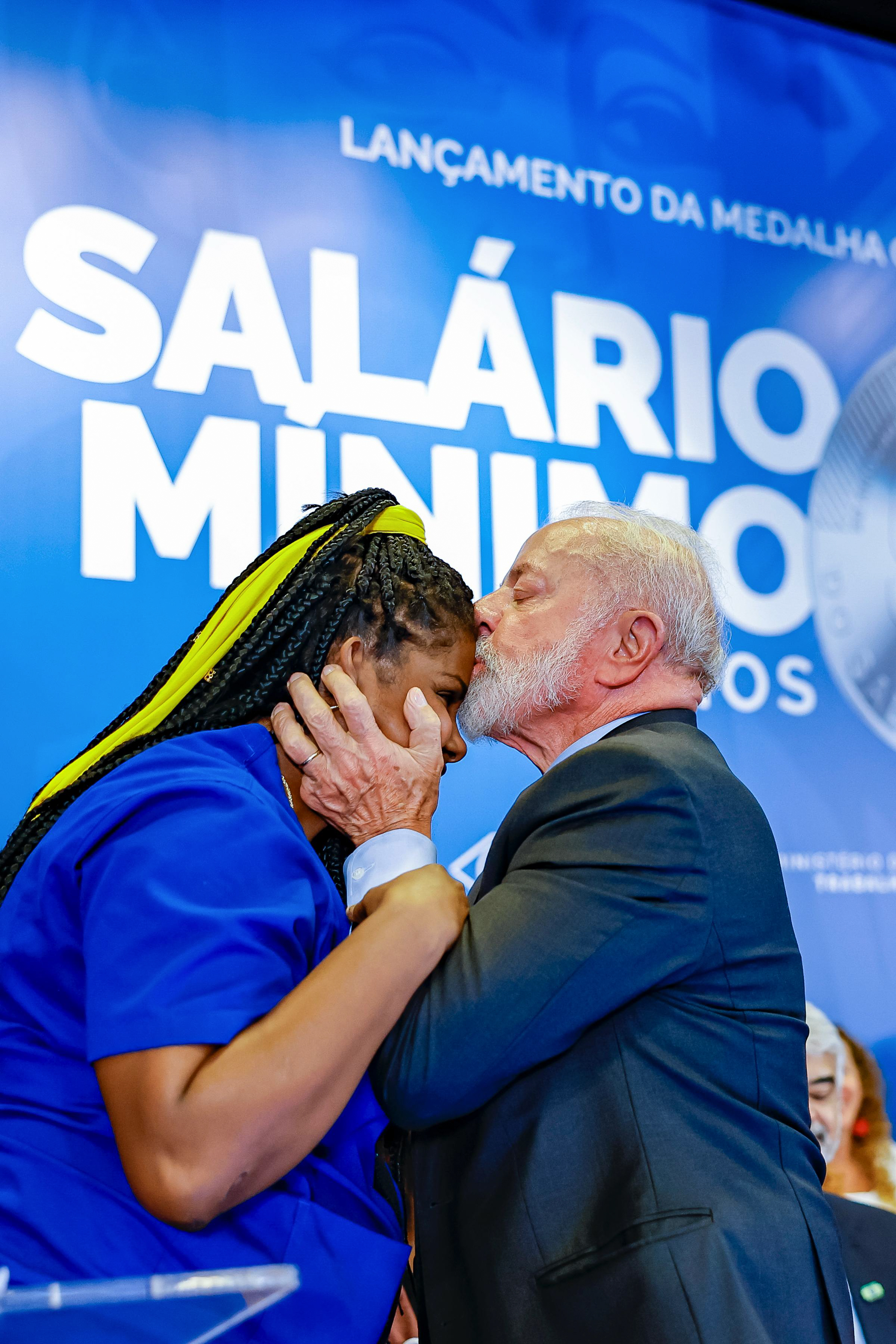 Durante a cerimônia, foi realizado o lançamento oficial de medalhas comemorativas pelos 90 anos do salário mínimo, produzidas pelos trabalhadores da Casa da Moeda do Brasil. Em seu discurso, o presidente Lula destacou o papel histórico do salário mínimo como instrumento de proteção social, combate às desigualdades e valorização do trabalho, ressaltando que, embora o valor atual ainda precise avançar, a política pública permanece como uma das mais importantes conquistas do povo brasileiro.